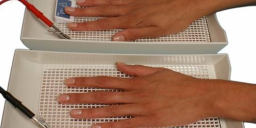 This consists of the application of a galvanic current to the affected region. How it works is still not well understood. It is efficacious in about 80% of cases. Daily applications are necessary in the beginning. The doctor must make perfect contact between the machine and the skin in order to keep “islands” of sweat from developing in the region. The sweating returns after the suspension of treatment. Occasionally Pruritus, Erythematous reactions, vesicles, changes in sensitivity, etc. may occur. Second degree burns and even Necrosis have been described in the scientific literature. It is used to treat Palmar, Plantar and Axillary Hyperhidrosis.